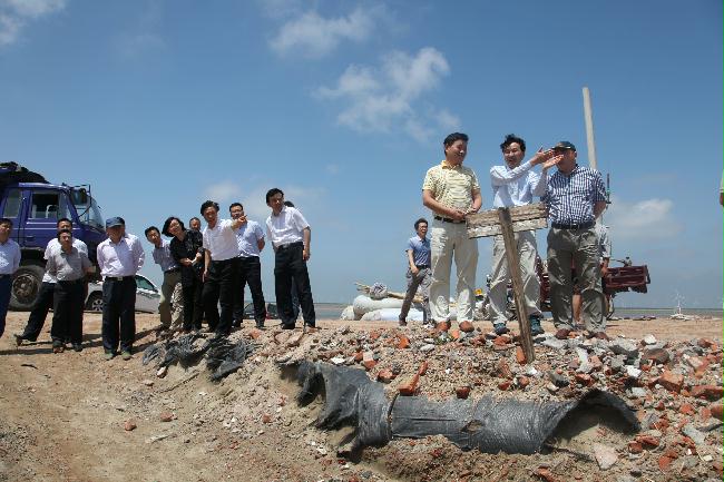 受西大港潮溝擺動(dòng)及6月7日至9日風(fēng)暴潮影響,條子泥一期工程?hào)|堤部分段面出現(xiàn)圍堤防護(hù)工程垮塌,局部堤身被破壞的險(xiǎn)情,嚴(yán)重影響已成型海堤安全。為盡快修復(fù)受損段面,抑制港槽進(jìn)一步向海堤擺動(dòng),采取科學(xué)合理的工程措施避免工程再次遭受較大損失,在集團(tuán)公司領(lǐng)導(dǎo)的要求下,2013年6月14日,省沿海開(kāi)發(fā)集團(tuán)有限公司在東臺(tái)弶港組織召開(kāi)了“條子泥一期工程?hào)|堤險(xiǎn)段防護(hù)方案”咨詢(xún)會(huì)。會(huì)議邀請(qǐng)了規(guī)劃研究、設(shè)計(jì)、施工等方面的相關(guān)專(zhuān)家,就四標(biāo)2東堤受風(fēng)暴潮影響及西大港潮溝擺動(dòng)對(duì)新建海堤的威脅,當(dāng)前須采取的防護(hù)及潮溝治理方案進(jìn)行咨詢(xún)。集團(tuán)公司陳才俊副總經(jīng)理,投資發(fā)展處徐向紅處長(zhǎng),東臺(tái)公司周金陽(yáng)總經(jīng)理及條北片匡圍工程建設(shè)、施工、監(jiān)理單位的代表參加了咨詢(xún)會(huì)。